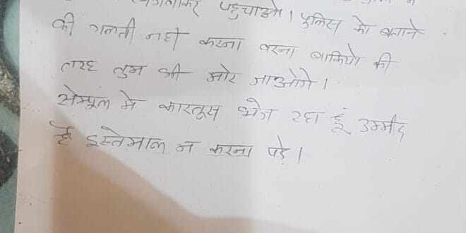 पत्र के साथ बदमाश ने भेजा जिन्दा कारतूस , रंगदारी न देने पर जान से मारने की दी धमकी ,