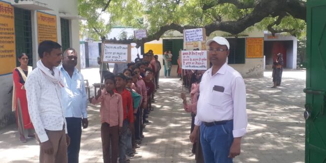मिश्रित /सीतापुर । विकासखंड मिश्रित की ग्राम पंचायत लकड़ियामाऊ के कम्पोजिट विद्यालय के छात्र छात्राओं ने ग्राम पंचायत में रैली निकाल कर लोगों को शत प्रतिशत मतदान करने के लिए लोगों को जागरूक किया । आपको बता दें कि वर्तमान लोकसभा चुनाव में मत प्रतिशत बढ़ाने के लिए जिला प्रशासन की ओर से स्वीप अभियान चलाया जा रहा है । जिसके तहत ग्राम पंचायत लकड़ियामाऊ के ग्राम प्रधान मोनू कुमार व पंचायत सचिव हरीश कुमार के नेतृत्व में कम्पोजिट विद्यालय के शिक्षकों ने छात्र , छात्राओं की रैली निकाल कर ग्रामीणों को मतदान करने के लिए जागरूक किया । छात्र , छात्राओं ने पोस्टरों के माध्यम से मतदाताओं को शत प्रतिशत मतदान करने के लिए प्रेरित किया । प्रधानाचार्य ने कहा कि जो युवा 18 वर्ष की उम्र पूर्ण कर चुके है । वह अपना नाम वोटर लिस्ट में शामिल कराकर मतदान अवश्य करें । साथ ही परिजनों व दोस्तों को भी शत प्रतिशत मतदान करने के लिए प्रेरित करें । इस रैली में छात्र छात्राओं ने मतदान जागरूकता के लिए पोस्टर बनाए और स्लोगन लिखा कि पहले मतदान करें , फिर जल पान करें । इस अवसर पर राजेश कुमार , प्रदीप कुमार , संग्राम सिंह , जगतपाल मौर्य आदि सैकड़ो लोगों ने भाग लिया ।