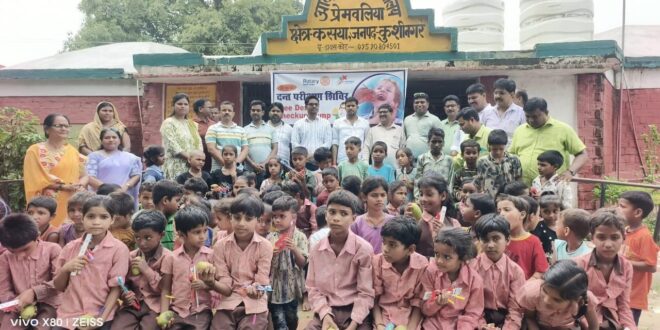 कसया /कुशीनगर । रोटरी क्लब कुशीनगर ने गुरुवार को प्राथमिक विद्यालय प्रेमवालिया में बच्चों के लिए नि:शुल्क दंत परीक्षण शिविर का आयोजन किया। इस शिविर में बच्चों को टूथब्रश, टूथपेस्ट, टंग क्लिनर एवं फल का वितरण किया गया। सामुदायिक स्वास्थ्य केंद्र कसया के चिकित्साधिकारी दंत सर्जन डॉ. रितेश कुमार एवं डॉ. श्याम बिहारी जायसवाल ने शिविर में बच्चों के दांतों की जांच की साथ ही उन्हें दांतों की सही प्रकार से देखभाल, सुरक्षा, एवं ब्रश करने और उसके सही उपयोग के बारे में भी जागरूक किया। बच्चों ने इस अवसर पर दांतों की सही देखभाल के महत्वपूर्ण सुझावों को ध्यान से सुना और उनका पालन करने का संकल्प लिया।