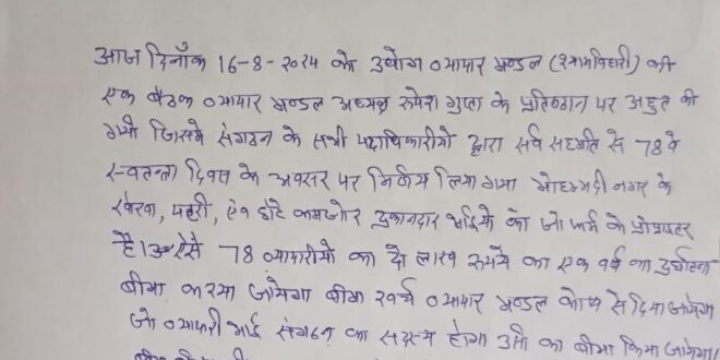 उद्योग व्यापार मंडल श्याम बिहारी गुट की एक बैठक अशोक चौराहा व्यापार मंडल अध्यक्ष के प्रतिष्ठान पर संपन्न हुई।व्यापारियों के लिए लिए गए हम निर्णय।बैठक में व्यापार मंडल अध्यक्ष रूपेश गुप्ता ने बताया स्वतंत्रता दिवस के अवसर पर मेरा मोहम्मदी नगर के व्यापारी जैसे खोखा पटरी एवं कमजोर दुकानदार को जो फर्म के प्रोपराइटर है।ऐसे 78 व्यापारियों का 2 लाख रुपए का 1 वर्ष का दुर्घटना बीमा संगठन की तरफ से कराया जाएगा।जिसका पूरा खर्च व्यापार मंडल कोष से दिया जाएगा।जो व्यापारी संगठन का सदस्य होगा उसी का बीमा कराया जाएगा।बीमा की पॉलिसी अक्टूबर माह से वितरित की जाएगी।उक्त अध्यक्ष के फैसले पर पदाधिकारी ने अपनी सहमति जताई।वहीं व्यापारियों ने व्यापार मंडल अध्यक्ष की जमकर तारीफ की