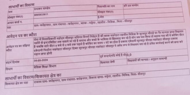 मिश्रित /सीतापुर । तहसील क्षेत्र के ग्राम फतेहनगर निवासी प्रभाकर पांडेय पुत्र हरिदत्त पांडेय ने जिलाधिकारी को संबोधित एक शिकायती पत्र मुख्यमंत्री जनसुनवाई पोर्टल पर शिकायत दर्ज कराकर आरोप लगाया है कि विकासखंड मछरेहटा के सूरजपुर चौराहे पर नर्सरी से लेकर इंटर मीडिएट तक कई विद्यालय गैर मान्यता के अवैध रूप से संचालित किए जा रहे हैं । इन विद्यालयों के संचालकों द्वारा छात्र छात्राओं के भविष्य को अंधेर मय किया जा रहा है । उनके भविष्य के साथ खिलवाड़ की जा रही है । इन विद्यालयों में पंजीकृत छात्र छात्राओं के अभिभावकों ने जब पता किया तो उन्हें यह बताया गया कि यहां विद्यालय के साथ कोचिंग सेंटर भी संचालित किया जा रहा है । आपको बता दें कि प्रकाश एकेडमी सूरजपुर चौराहा , प्रकाश एकेडमी ग्राम बिठौरा , तथा दिव्या विद्यालय सूरजपुर चौराहा आदि कई बिना मान्यता के विद्यालय यहां पर तैनात खंड शिक्षाधिकारी के संरक्षण में अवैध रूप से संचालित किए जा रहे हैं । अब सवाल यह उठता है कि आखिर इन विद्यालयों में पंजीकृत छात्र-छात्राओं को किस विद्यालय द्वारा मार्कशीट और टीसी दी जाती है । इस विद्यालय में पंजीकृत छात्र छात्राओं के अभिभावको का आरोप है कि यहां पर अवैध रूप से संचालित सभी विद्यालयों की जांच कराकर उनके विरुद्ध सख्त कार्यवाही की जाय । ताकि नन्हे मुन्ने बच्चों का भविष्य सुरक्षित रह सके ।