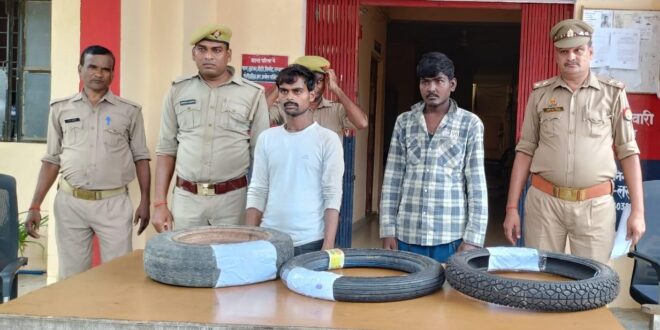 एसीपी रजनीश वर्मा ने बताया बीते सोमवार की देर रात निगोहां थाना क्षेत्र के भगवानपुर कस्बे में स्थित गनी टायर हाउस की दुकान का ताला तोड़कर चोर क ई टायर व ट्यूब चुरा ले गये थे.पीड़ित दुकानदार मो०शमी निवासी भगवानपुर की तहरीर पर अज्ञात चोरो पर मुकदमा दर्ज कर घटना के खुलासे के लिये थाना प्रभारी अनुज कुमार तिवारी समेत पुलिस टीम को लगाया गया था।बुधवार को मुखबिर की सूचना पर उपनिरीक्षक निशान्त कुमार व उपनिरीक्षक कुलदीप कुमार ने पुलिस टीम के साथ नगराम रेलवे क्रासिंग के पास से दो शातिर चोरो को गिरफ्तार किया।पुछताछ करने पर शातिर चोरो ने अपने नाम आकाश निवासी भावाखेड़ा थाना मोहनलालगंज व अतुल कुमार निवासी हरिवंशखेड़ा थाना निगोहां बताते हुये टायर हाउस समेत 31अगस्त को नगराम में घर के के बाहर खड़ी कार का अगला पहिया खोलकर चोरी किये जाने की बात कही।शातिर चोरो की निशानदेही पर पुलिस ने दो नये टायर व मारूति कार का पहिया बरामद किया।थाना प्रभारी अनुज कुमार तिवारी ने बताया दोनो शातिर चोरो को बरामद माल के साथ न्यायालय में पेश किया गया,जहां से दोनो को जेल भेज दिया गया।