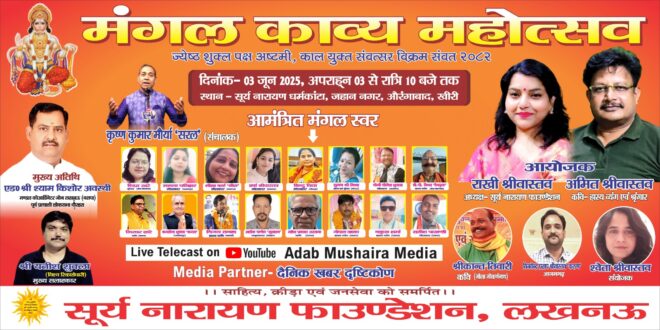 मोहम्मदी खीरी:- सूर्य नारायण फाउंडेशन के संस्थापक अमित श्रीवास्तव व राखी श्रीवास्तव द्वारा आज दिनांक 3 “6” 2025 दिन मंगलवार को सूर्य नारायण धर्म कांटा जहान नगर बरवर औरंगाबाद रोड पर विशाल भंडारे के पश्चात दिन में 3:00 बजे से अखिल भारतीय कवि सम्मेलन का आयोजन किया जाएगा जिसका संयोजन कवित्री श्वेता श्रीवास्तव करेंगी इस कवि सम्मेलन में देश के प्रतिष्ठित कवि व कवित्रियां पधार रही हैं इसमें मुख्य रूप से विनय तन्हा , गिरधर खरे ,गोपाल ठहाका, योगेश शुक्ला, विजेंद्र श्रीवास्तव, वर्षा श्रीवास्तव, श्रीकांत तिवारी, कृष्ण कुमार मोर्या सलर,अमित श्रीवास्तव , सुमनश्री मिश्रा, श्वेता श्रीवास्तव, भगवती प्रसाद मिश्र, शिप्रा खरे, अशोक पांडे गुलशन, नकुल शर्मा, महेश अस्थाना, ममता परिहार, शीला शर्मा मीरा, विंदु प्रभा,यतीश शुक्ला, सतीश पाखंडी शामिल होंगे, जो कार्यक्रम देर रात कल चलेगा