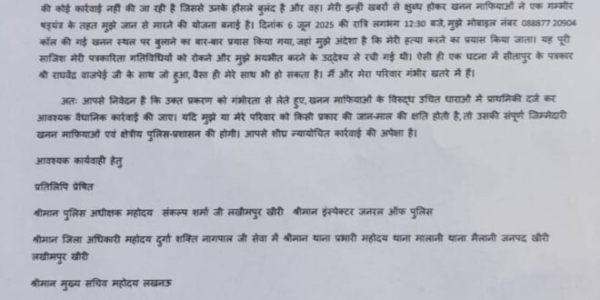 *संसारपुर खीरी* थाना मैलानी क्षेत्र में अवैध खनन का सच उजागर कर रहे पत्रकार पीयूष दीक्षित के खिलाफ गहरी साजिश रचने का खुलासा हुआ है। ग्रामीणों की सूचना पर लगातार खनन माफियाओं की पोल खोलते हुए पीयूष दीक्षित ने कई अहम समाचार प्रकाशित किए। जिससे बौखलाए खनन माफिया अब उन्हें राघवेंद्र वाजपेई कांड की तर्ज पर गंभीर क्षति पहुंचाने की साजिश रच रहे हैं। सूत्रों के मुताबिक, खनन माफियाओं ने पत्रकार को विभिन्न तरीकों से खनन स्थल पर बुलाने की कोशिश की ताकि कोई बड़ी वारदात को अंजाम दिया जा सके। पत्रकार पीयूष दीक्षित ने समय रहते खतरे को भांपते हुए प्रशासन को पत्र लिखकर अवगत कराया कि यदि उन्हें या उनके परिवार को कोई जान-माल की हानि होती है तो इसका सीधा जिम्मेदार क्षेत्रीय प्रशासन एवं खनन माफिया होंगे। पीयूष दीक्षित ने यह प्रार्थना पत्र जिला अधिकारी लखीमपुर खीरी, पुलिस अधीक्षक लखीमपुर खीरी, डीजीपी उत्तर प्रदेश, मुख्य सचिव उत्तर प्रदेश एवं मुख्यमंत्री उत्तर प्रदेश को प्रेषित किया है। उन्होंने शासन से मांग की है कि खनन माफियाओं पर सख्त से सख्त कार्रवाई की जाए एवं उन्हें सुरक्षा प्रदान की जाए। पत्रकार पीयूष दीक्षित का कहना है कि वे अपनी जिम्मेदारी का निर्वहन करते हुए जनता की आवाज बने हैं और अवैध गतिविधियों को उजागर कर रहे हैं। लेकिन इसके बदले उन्हें धमकियों और जानलेवा साजिशों का सामना करना पड़ रहा है।”जनता की मांग:”स्थानीय लोगों एवं पत्रकार संगठनों ने प्रशासन से मांग की है कि पत्रकारों को पूरी सुरक्षा प्रदान की जाए और खनन माफियाओं पर कठोर कार्यवाही की जाए ताकि लोकतंत्र का चौथा स्तंभ सुरक्षित रह सके।