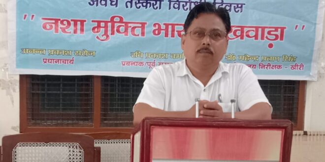 गोला गोकर्णनाथ खीरी।12 से 26 जून चल रहे नशा मुक्त भारत पखवाड़ा का समापन समारोह का कार्यक्रम कृषक समाज इंटर कॉलेज में प्रधानाचार्य अनंत प्रकाश सरोज की अध्यक्षता में संपन्न हुआ कॉलेज के जीव विज्ञान प्रवक्ता अनिल कुमार ने बताया कि इस कार्यक्रम का उद्देश्य युवाओं को नशे के दुष्प्रभावों से अवगत कराना और राष्ट्रीय एकता को सशक्त बनाना था. नशीली दवाओं के सेवन से होने वाले शारीरिक, मानसिक और सामाजिक दुष्परिणामों की जानकारी दी. साथ ही भारत की विविधतापूर्ण सांस्कृतिक विरासत और स्वस्थ जीवनशैली को अपनाने के लिए युवाओं को प्रेरित किया गया. विद्यालय के राष्ट्रीय सेवा योजना की छात्रा अंशिका सोनी रिया पटेल एनसीसी की छात्रा भगवती ने अपने विचार प्रस्तुत किए और नशे के खिलाफ जागरूकता फैलाने की शपथ ली. वृंदावन छात्र-छात्राओं ने भाषण पोस्ट निबंध स्लोगन विविध प्रतियोगिता के माध्यम से जागरूकता अभियान चलाया प्रधानाचार्य ने बताया कि कार्यक्रम ने न केवल छात्रों में सकारात्मक सोच को बढ़ावा दिया, बल्कि उन्हें एक जिम्मेदार नागरिक बनने की दिशा में प्रेरित भी किया. इस अवसर पर विद्यालय के एनसीसी अधिकारी एस के वर्मा एनएसएस कार्यक्रम अधिकारी ओम प्रकाश यादव जसवंत कुमार संजय राज अनूप वर्मा सहित राष्ट्रीय सेवा योजना के छात्राएं उपस्थित रहे।