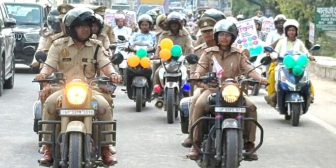 मोहनलालगंज।शारदीय नवरात्र पर महिलाओं और बालिकाओं की सुरक्षा, सम्मान व स्वावलंबन के लिए संचालित मिशन शक्ति फेज़-5.0 के तहत सोमवार को मोहनलालगंज कोतवाली से एसीपी रजनीश वर्मा व प्रभारी निरीक्षक दिलेश कुमार सिंह के नेतृत्व मे पुलिसकर्मियो व क्षेत्रीय महिलाओ समेत छात्राओ ने बाइक रैली निकाली।मोहनलालगंज कोतवाली से एसीपी व प्रभारी निरीक्षक के नेतृत्व में शुरू हुयी जागरूकता बाइक रैली मोहनलालगंज कस्बा व गौरा व बिन्दौवा गांव होते हुये वापस राधास्वामी संत्सग व्यास पर आकर समाप्त हुयी।रैली में शामिल महिला पुलिसकर्मियो ने जगह जगह रूककर बालिकाओं और महिलाओं को नारी सम्मान, नारी स्वावलंबन व नारी सुरक्षा के प्रति जागरूक किया।उन्हें हेल्पलाइन नंबरों जैसे कि वीमेन पावर लाइन-1090, महिला हेल्प लाइन-181, आपातकालीन सेवा-112, मुख्यमंत्री हेल्पलाइन नंबर-1076, चाइल्ड हेल्पलाइन-1098, स्वास्थ्य सेवा-102, एंबुलेंस सेवा-108 के संबंध में विस्तृत जानकारी दी गई। साथ ही उन्हें साइबर अपराध से बचाव और महिलाओं से संबंधित कानूनों की भी जानकारी दी गी।एसीपी व प्रभारी निरीक्षक ने रैली के दौरान कहा महिला सुरक्षा को सर्वोच्च प्राथमिकता दी जाएगी तथा महिलाओ और बच्चियो के खिलाफ किसी भी प्रकार के अपराध बर्दाश्त नही किये जायेगे।